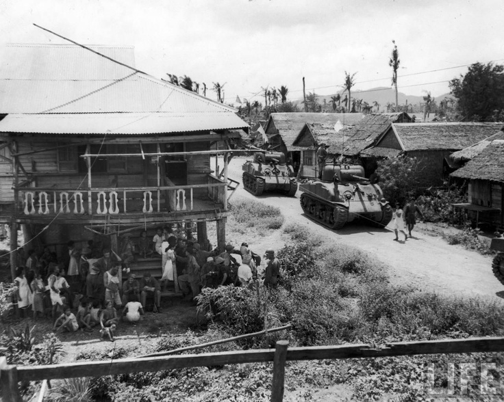 The plaza looked deserted, but if you looked hard you could see that everyone was hiding in their homes, risking an occasional furtive peep every so often. I could hear something like very loud trucks approaching. The sound got nearer and nearer. Then I heard Ole Jimmy gasp. “Geddemit!” he shouted. “It’s a geddemed tank! An American tank!” And sure enough a olive green tank trundled into the middle of the plaza, accompanied by a couple of halftracks.