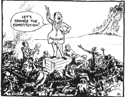 (Free Press editorial cartoon by the late E.Z. Izon, circa 1997) Of course media is also focused on the ongoing question pending before the Comelec: what to do with the so-called “people’s initiative”? Fidel Ramos says it’s all perfectly legal. Those who agree and disagree explain their respective positions. One way or another, it will reach the Supreme Court. Government faced with El Shaddai saying “no”. Inquirer editorial says government move is scary; Fr. Joaquin Bernas says the move is scary, but he trusts the Supreme Court cares about the verdict of history; Billy Esposo says constitutional amendments is the oligarchy’s Trojan horse. Edong Manabat cheekily argues for a monarchy.