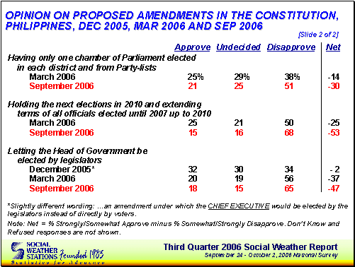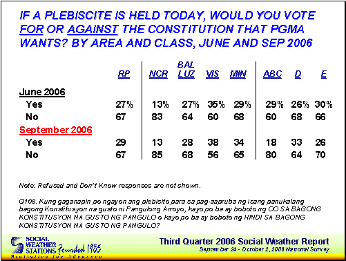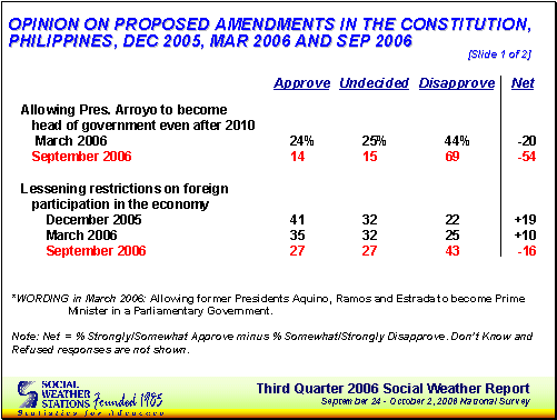 Seven out of ten (69%) reject the idea of allowing President Arroyo to become head of government even after 2010, up from 44% recorded in March 2006.