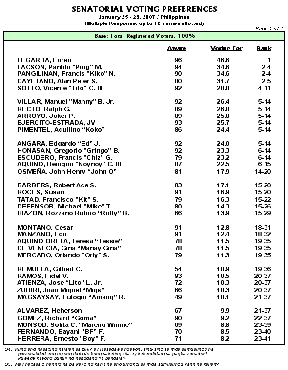 The names, and their rankings, are interesting. Basically, let’s consider the top 20 (Legarda to Biazon) names as those that are seriously in play for the campaign.