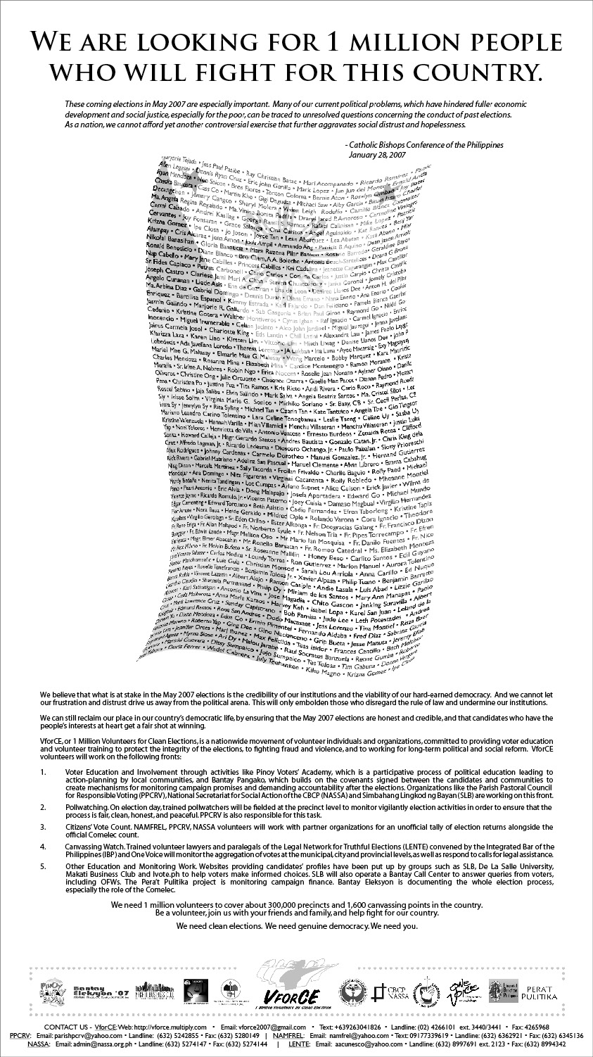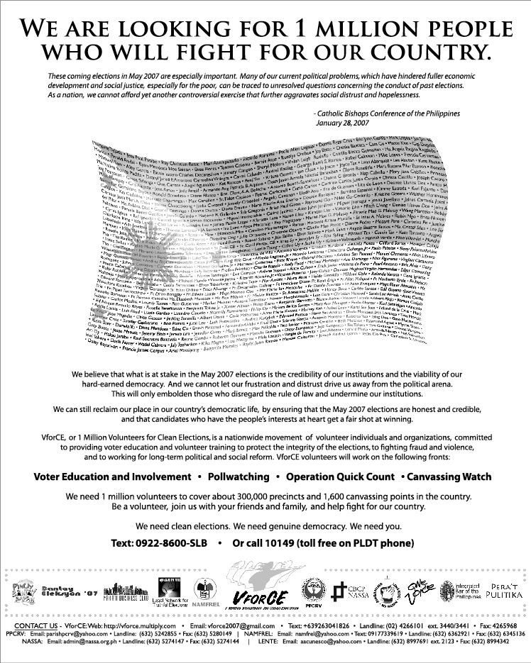 On military involvement in the polls: The disclosure that the Army has forced its soldiers to vote uniformly, and the revelation-caught on national TV-that soldiers deployed in Camarines Sur are campaigning for the President’s son, are equally serious. We must assume, even before an investigation is complete, that some military units will be used, again, in some form of cheating.