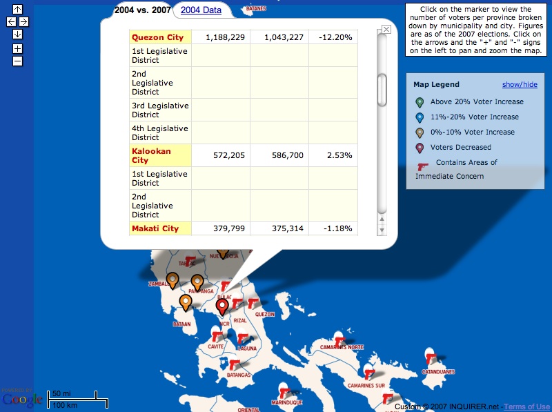 On voters’ registration, for example: A look at the interactive Google Map available on Inquirer.net shows that some of the traditionally vulnerable-to-fraud areas enjoyed a suspiciously high increase in new voters between 2004 and 2007, while traditionally oppositionist Metro Manila suffered an unusual decline. We must assume that this is already a form of cheating.