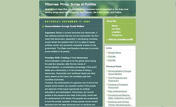 just wanted to clarify that the blog “Pilipinas: Pinoy, Buhay at Pulitika” was set up in 2005 by my graduate student and junior faculty at dlsu – jet olfato as a final requirement for my course on Constitutional Reforms. the postings were reflection papers on the weekly assigned readings so its ludricous for bel cunanan to claim that it was recently set up by “outraged parents.”