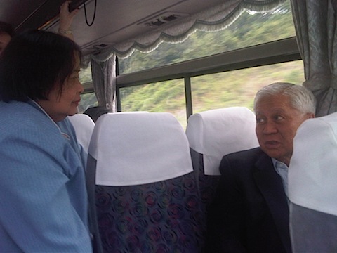 Onboard the bus to Ishinomaki City, Secretary del Rosario confers with Undersecretary Linda Basilio.