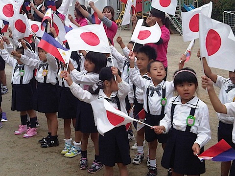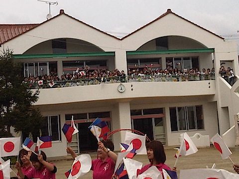 Japanese youngsters welcome the President to Ishinomaki Catholic Church.