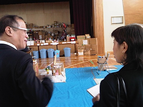 Refugees meet the President at the Kadonowaki Junior High School shelter.