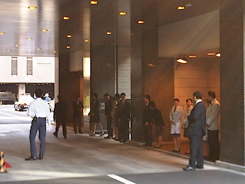 Staff of the Imperial Hotel prepare to bid the President farewell.