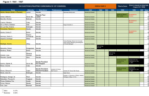 It also gives a glimpse into what the Senate was supposed to be, by design: geographically balanced, not by districts (the old senatorial districts, as one legislator, Jose E. Romero, who was from Hiligaynon-speaking Negros Occidental, had pointed out, were viewed in some respects as artificial constructs, lumping together areas without any real ethnic or linguistic affinity: the senatorial district he’d belonged to included Negros Oriental which is Bisaya-speaking) but rather, on the basis of competing slates that themselves would be geographically balanced based on party preferences, with candidates selected on the basis of political experience or in order to push national development (hence, as the chart shows, the significant presence of businessmen such as Vicente Madrigal and Ramon Fernandez).