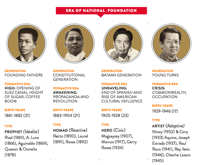Here is how the chart on the opposite page works: a description of the Generation; the characteristics of that Generation (its “Type”); the years in which the generation was born, and what was happening in that era. So Our Founding Father were Prophets (Idealists), born in 1861- 1882, who grew up in a High era, the time of the opening of the Suez Canal, who were active participants in the Awakening known as the Propaganda Movement and the Revolution, and who were the senior leaders in the Unraveling era and elders in the Crisis era of the Commonwealth, War, and Occupation. In this manner, each generation is born into an era, matures and rises to active leadership in the next, and reaches seniority and fades away in the era after that.