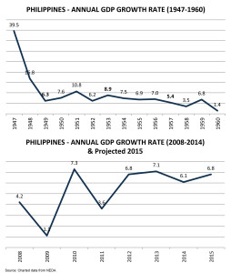 The readjustment to normality after the initial frenzy of rebuilding after the war meant there was a dip in growth, but after the economy returned to an even keel, it went on an upward trend in time for Quirino to be elected in 1949. It was also stable enough for Garcia to succeed in 1957. Before 2010, the economy also dipped due to the global economic crisis and depressed confidence, but was able to recover, buoyed as much by people regaining their optimism in expectation in a change of administrations, as the eventual outcome of that change. During President Aquino’s term, after an initial period of adjustment, when government reviewed its priorities and processes, the economy has bucked the regional trend and continued to grow.