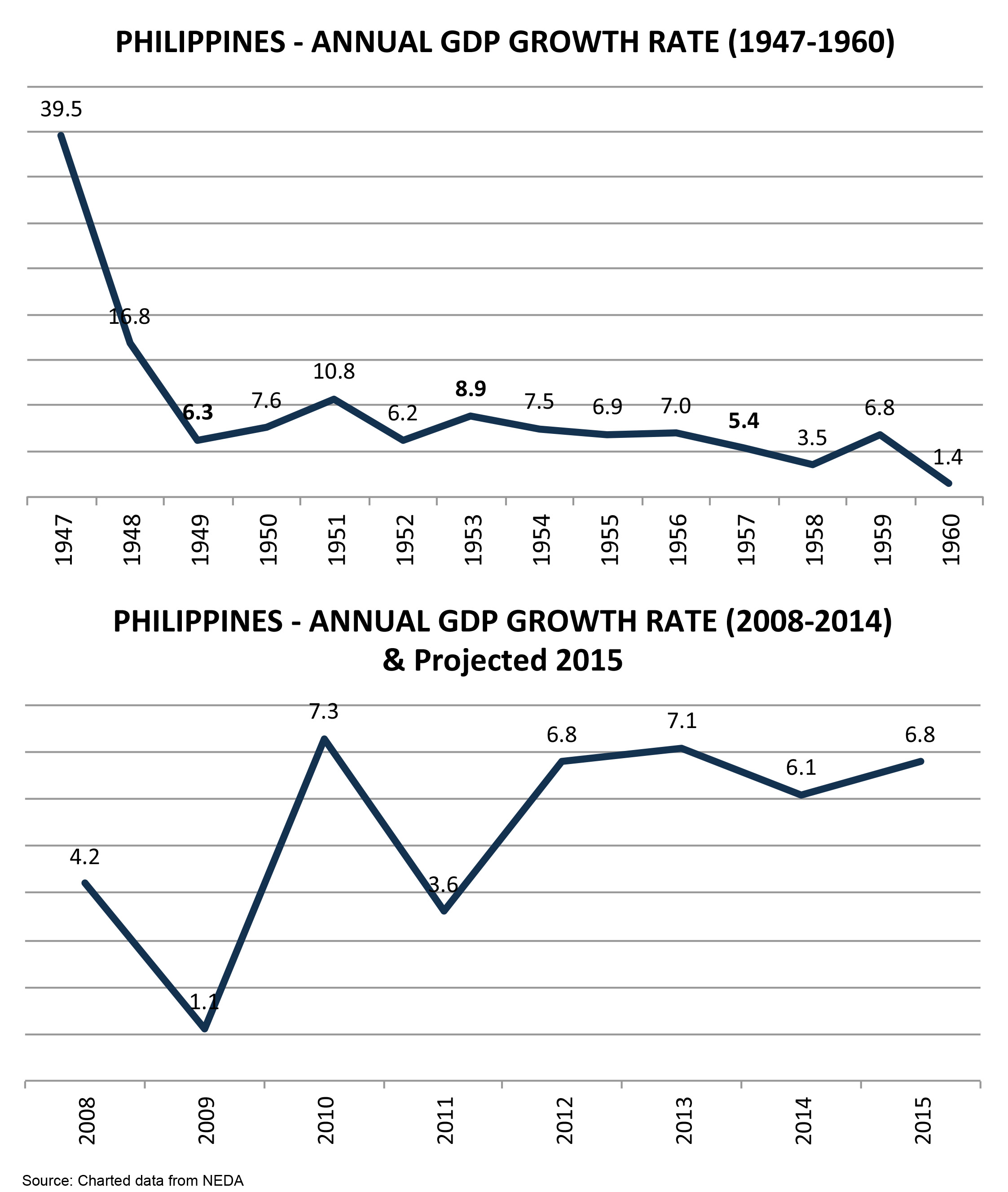 If perception is reality, then numbers, however impressive, have to be accompanied by the perception that the economy is being handled well. Historical GDP growth rates show that prior to 1949, the Philippine economy was experiencing low growth rates after the initial burst of activity when the country, basically flattened by World War II, had nowhere to go but up, resulting in stratospheric rates of growth compared to the devastation of the war.