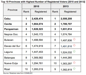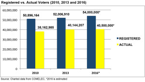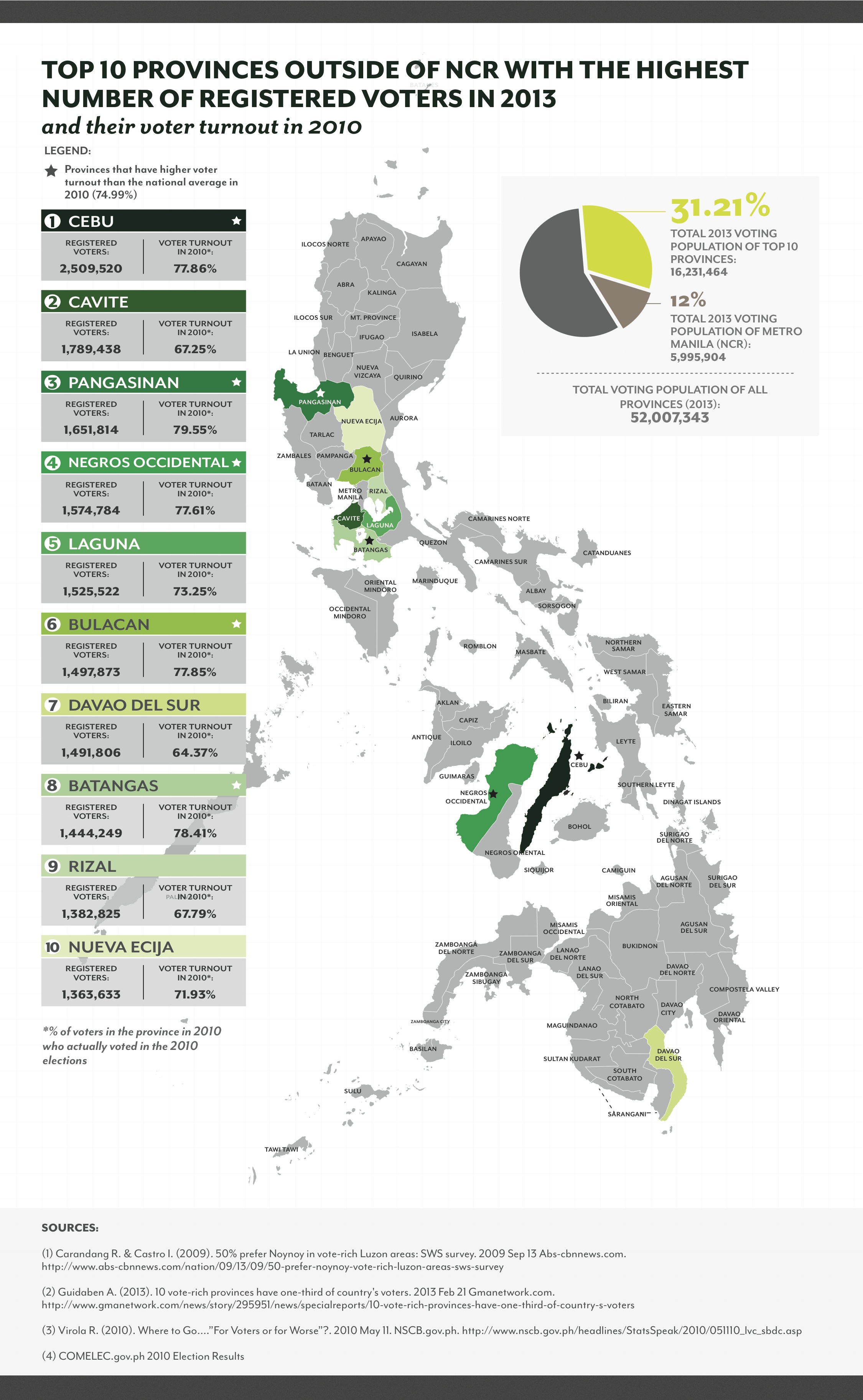 There were 74.98% registered voters who voted in 2010, while 77.2% of those who registered voted in 2013. Similarly, COMELEC is projecting a 75% turnout in 2016 with an estimate of 40.5 million votes out of the 54 million projected registrants