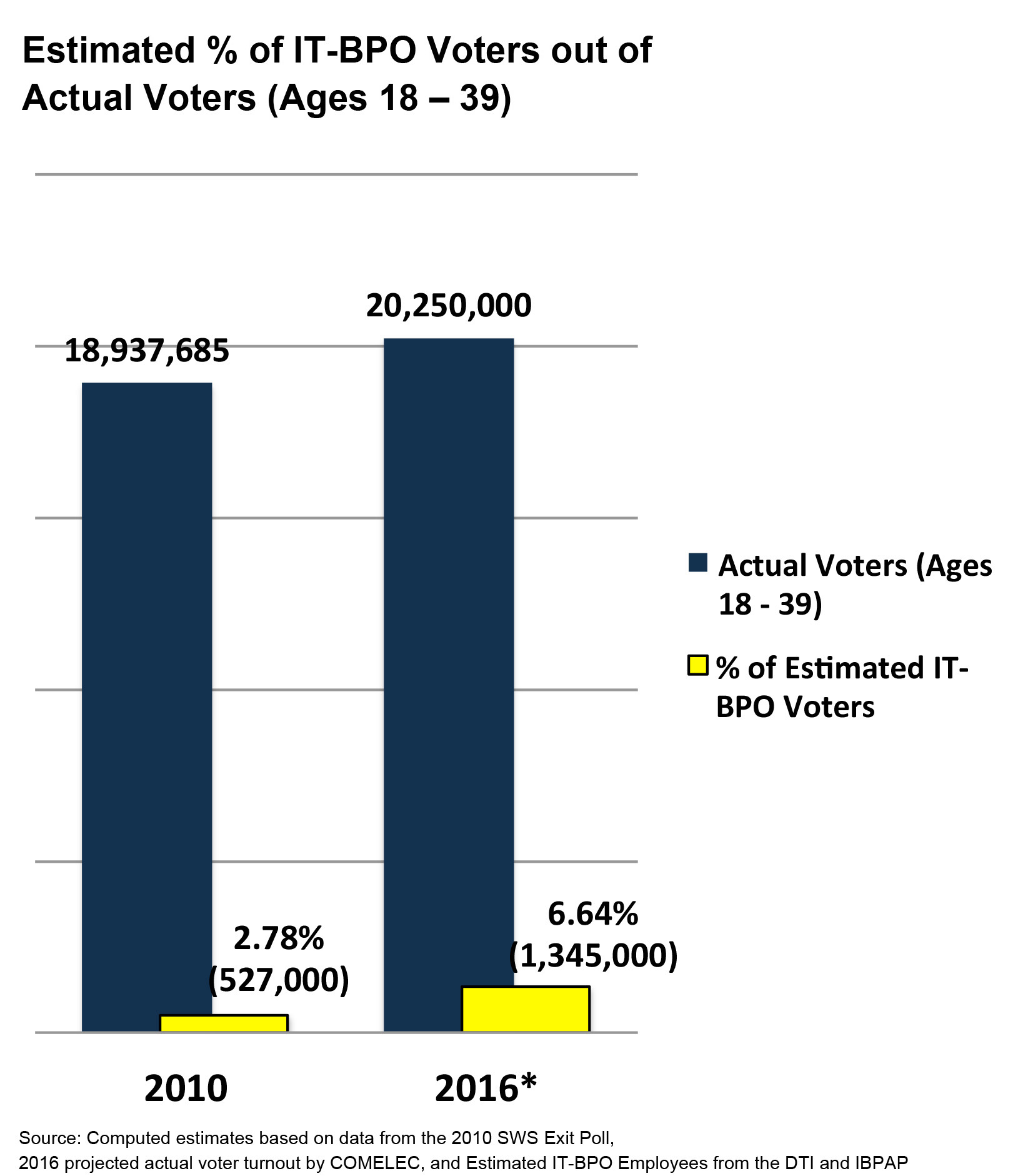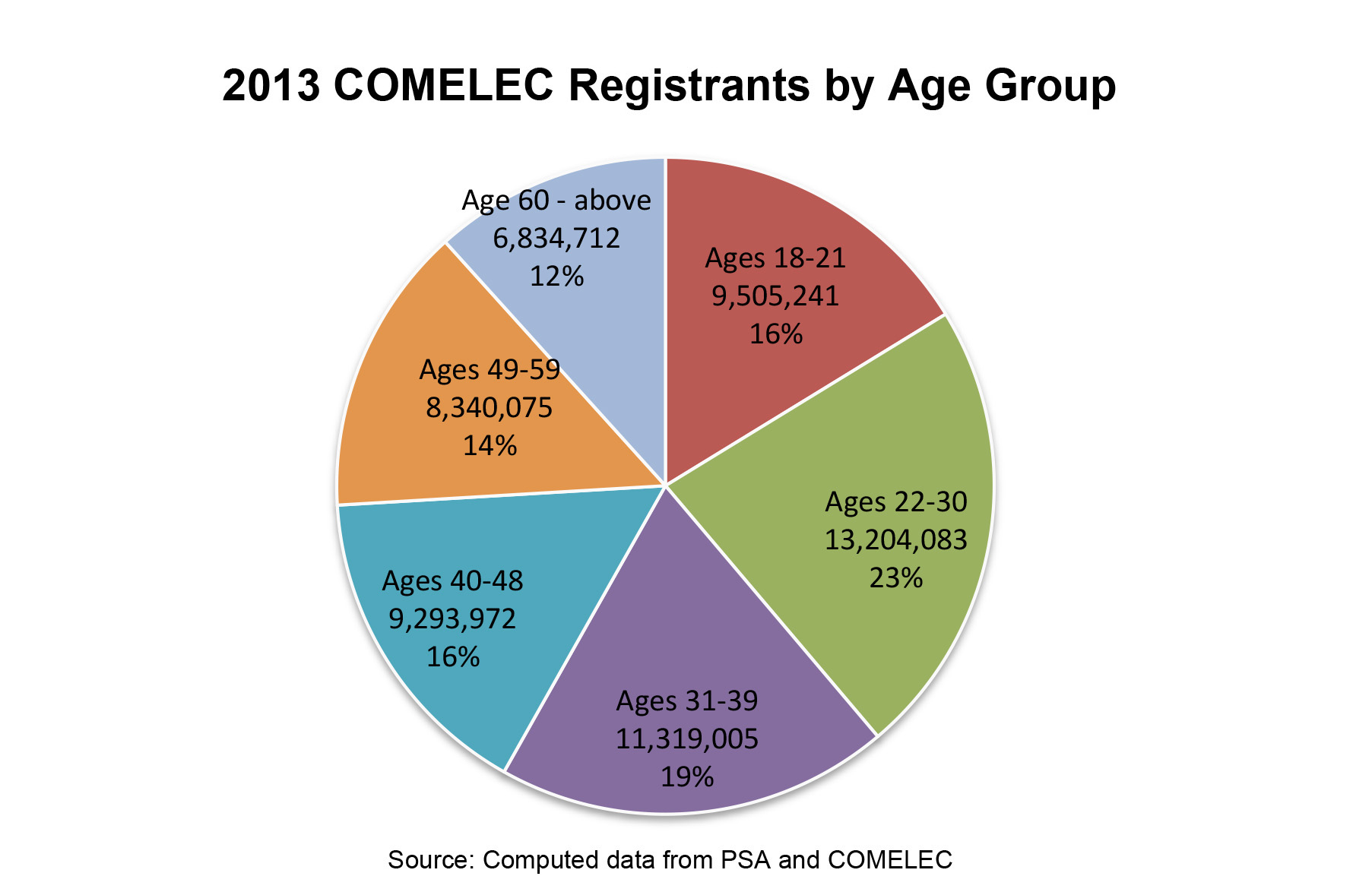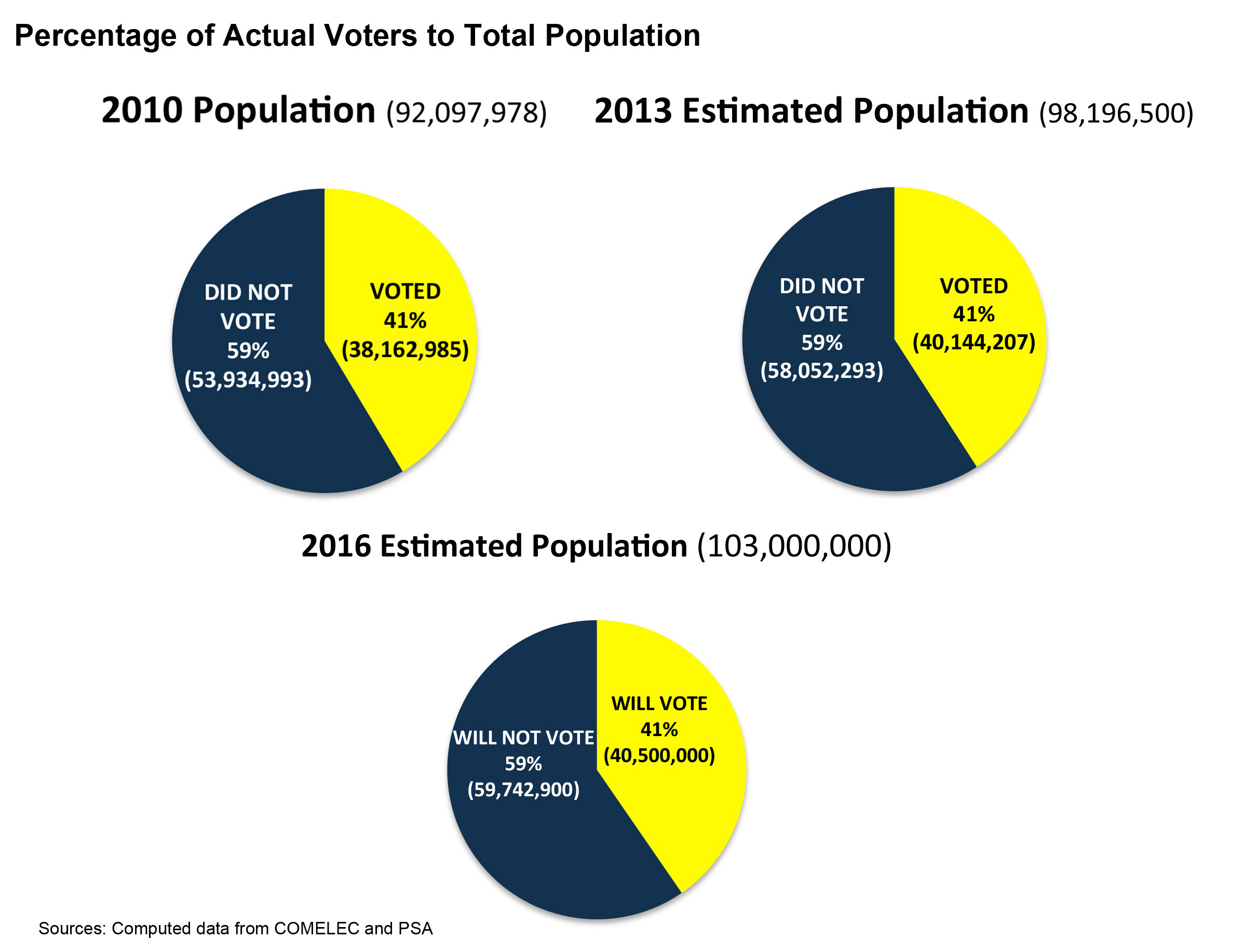 In 2010, only 41% of the total population voted while 59% did not. Based on the population projections by the Philippine Statistics Authority (PSA), the percentage of voters in 2013 was still about 41%. Based on COMELEC and PSA estimates, the same percentage of voters out of the total population is also expected in 2016 at around 40.5 million.