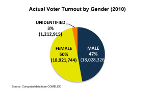 Of the 38 million who voted in 2010, though almost equal, slightly more females (50%) voted than the males (47%). COMELEC was unable to record the gender of 3% of the actual votes.