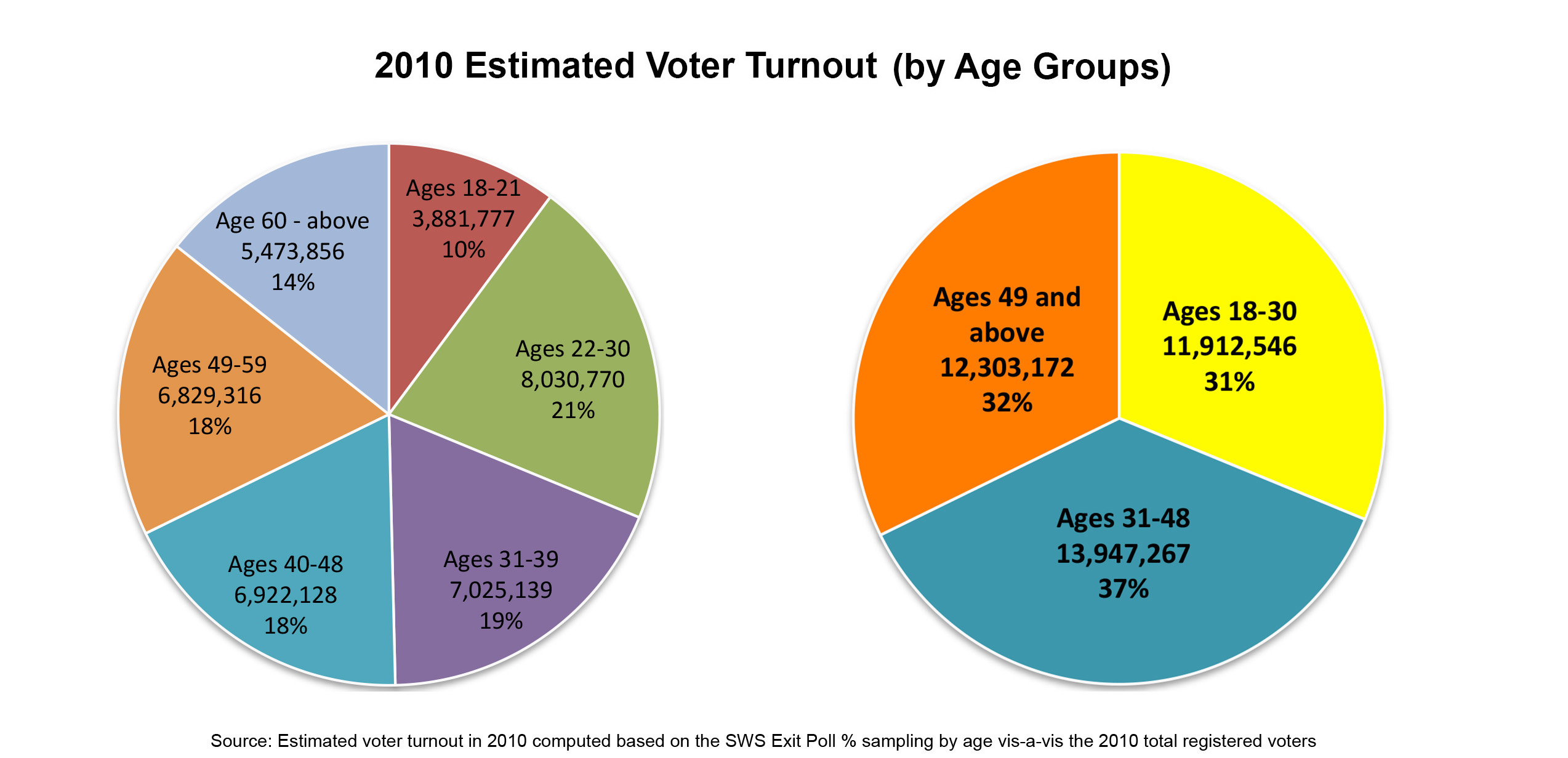 I would like to acknowledge the assistance of the following in the preparations of the charts, visuals, and data: Gino Bayot, Mica Olaño, Celina Cua, Smile Indias, Cherie Tan, Camille del Rosario, and Atom Ungson, as well as SWS for the sampling age breakdown of their 2010 exit poll, and Pulse Asia Research for their sampling profile data, that was used to make estimates on voters statistics.