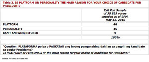 But another thing I pointed out in 2013 suggests a simpler explanation for the above. Back then, I pointed in turn to a 2010 survey that revealed that as far as the public is concerned, “news” as a source of information had an incredibly elastic definition: “news” could come from the evening news, but it could also come from a game show—and game shows, for example, have a gigantic audience compared to the news. So it may be, too, for what constitutes a “platform” for the public—slogans, speeches, anything and everything where a candidate’s opinions (and thus, position, on a question) might constitute a “platform.” Personality, then, in the survey above, could then refer to all the other intangibles—likeability and credibility, for example.