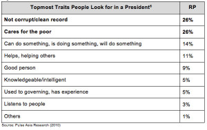The rankings above represent a snapshot of the whole. Similarly, the most frequently mentioned qualities of a good leader, based on the Institute of Philippine Culture study of the poor reported by the PCIJ in 2004, are the following[1]: