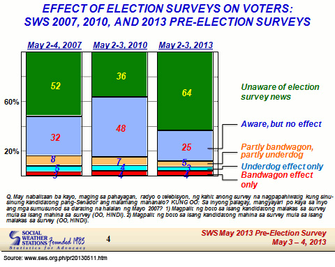 A brief note on surveys: The SWS Pre-election Survey in 2013 found that most people are unaware of election survey news and the influence of election surveys on voting decision is weak.[3]