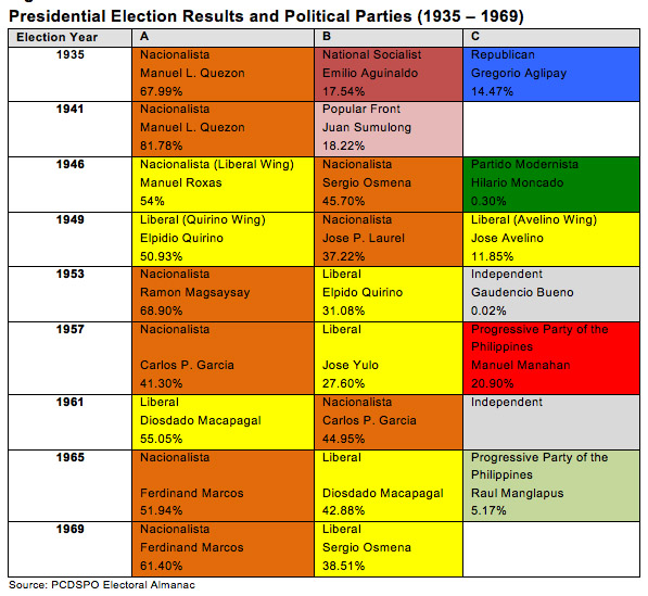 From 1935 to 1969, only candidates from two parties, Nacionalista and Liberal, won the Presidency. In 1935, 1949, 1957 and 1965, strong third-party candidates affected the outcome by splitting or eroding, either the administration or opposition vote. But on the whole, the electorate had two choices to pick from. This was because the rules only allowed electoral observers from the top two parties in the previous election. This in turn meant there was little incentive, both for candidates and voters, to attempt to be anything other than a candidate of one of the two major parties. In his book Yuko Kasuya describes this as follows, using something called Duverger’s Law: “When only one candidate can win, voters would expect that those who have a serious chance of winning are the first and second runners and voting for a third runner means wasting votes, therefore they may eventually shift their support from third to the first or second runners. This is known as strategic voting. Politicians, anticipating this strategic behavior of voters, would refrain from entering the race unless they expect to be one of the top two candidates.”