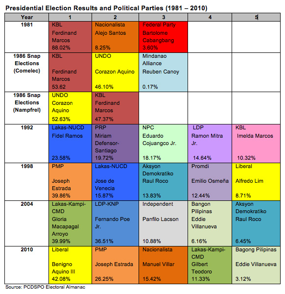 2010, on the other hand, marked what Thompson has described as a contest between Reform and Populism, with Estrada and Villar dividing the populist vote, and Aquino, Teodoro, and Villanueva divvying-up the Reform vote. And as I pointed out in February, 2010, there was the behind-the-scenes shadow of the 1986 showdown, too: Aquino was literally the incarnation of the EDSA Coalition of 1986; ranged against him were veterans of the Marcos machine: Estrada, Villar (through his in-laws), Teodoro and Gordon had all been Marcos men.