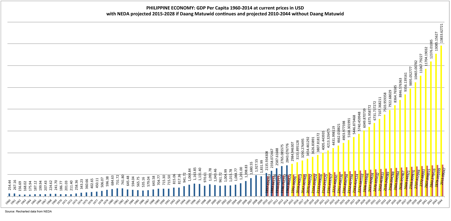 Figure 6. GDP per Capita 1960-2014 at current prices in USD with NEDA projected 2015-2044 if “Daang Matuwid” continues and projected 2010-2044 w/ “Daang Tiwali”