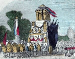 Louis Philippe, the Orléans king, was in power at the time of the Retour des Cendres. This was not the first time attempts had been made to return his mortal remains to France. When Napoleon died, an appeal was immediately made for the return of his body. Contrary to popular belief at the time, it was not the English who were preventing the return of his remains. Indeed the English government had made it clear to their French equivalents that « le gouvernement anglais ne se regardait que comme le dépositaire des cendres de l’Empereur et qu’il le rendrait à la France dès que le gouvernement français lui en témoignerait le désir ». But in 1821, the government of Louis XVIII was little disposed to bringing the Emperor’s mortal remains back. Louis did not want Bonapartist sentiments to return to the surface, especially with the royalists in power and the potential for a coup d’état. When Louis-Philippe ascended to the throne a petition was presented to the Chambre des députés in an appeal for the return of Napoleon. Although Heulard de Montigny “considered the reign of Napoleon to be the most brilliant time for France”, he failed to convince any of his colleagues. Throughout the 1820s and 1830s other attempts failed.