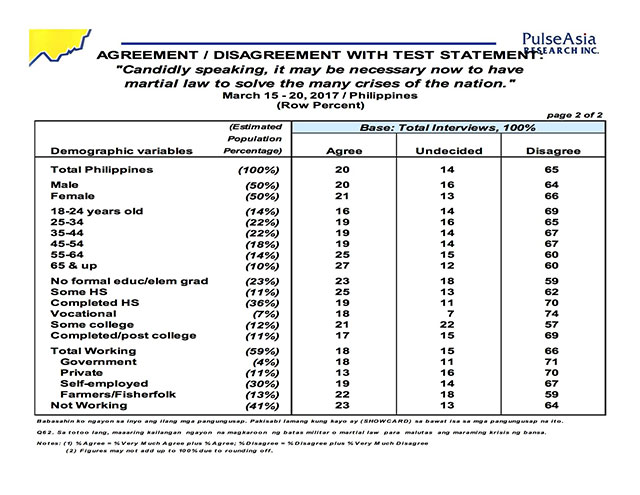 As he observed, “In the March 2017 survey, 65 percent disagreed with Martial Law as a solution. 71 percent in NCR, 76 in the rest of Luzon, and 58 in Mindanao. Visayas registered lowest disagreement at 45 percent with 36 percent agreeing.”