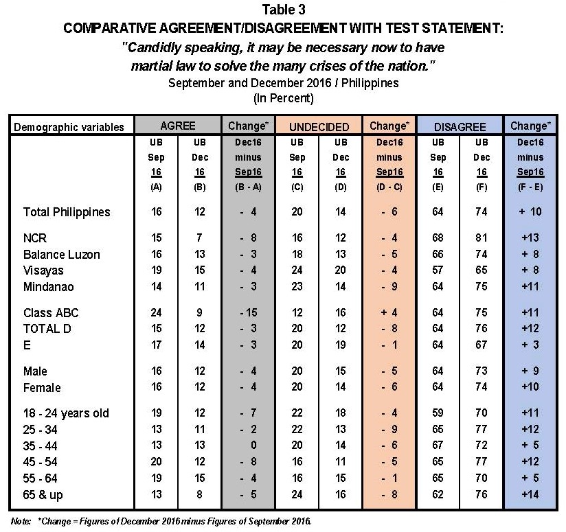 Last January, Pulse Asia had released survey results with the following snapshot of public opinion as of December, 2016 (and had also asked the same question in September of that year). Back then, the President had most recently proposed amending the Constitution to give more teeth to a martial law declaration.