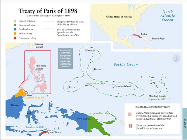 But even this map was the result of subsequent editing, so to speak. Remember Palau? The story of how our country came to be defined by the map you see above unfolded even as the First Republic was still fighting for its life. First, of course, was the decision of the United States and Spain to settle matters, ignoring the existence of our First Republic. The Philippines, as defined by the red bordered area below, was transferred to the United States, which also gained Puerto Rico and Guam. Cuba was given its independence, but as an American protectorate.