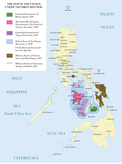 The Visayas in the time of the First Republic, 1898-99: Showing the different states as they originally came into being, their union as a Federal State, and the military districts that overshadowed them.
