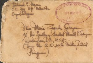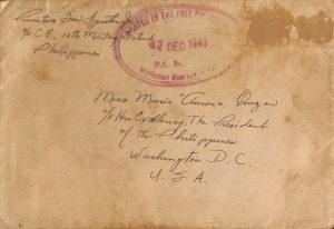 Back in the 1990s, asked about Ferdinand Marcos and his wartime record, my aunt Nini (Zeneida Quezon Avanceña) said that while it may have been exaggerated, she knew for a fact he had been with the guerrillas, because she had received a letter from him by submarine in 1943. Two decades later, sorting through family papers, I found two letters that confirm this recollection. One ostensibly dated December 3, 1942 and the other, dated December 2, 1943. The envelope is postmarked “Posted in the Free Philippines, Mindanao,” December 17, 1943. Both are on exactly the same paper.