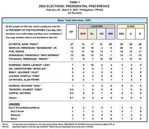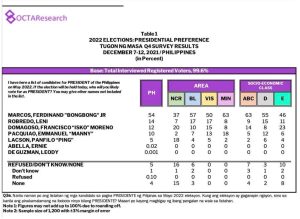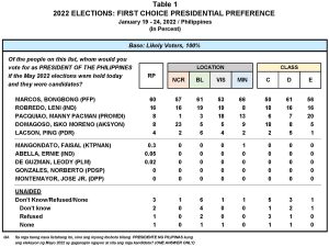 Pulse Asia Research began as a breakaway group from SWS. Note that it’s January, 2022 survey has a larger than usual sample size (2,400 respondents) and thus a smaller than usual margin of error (2%).