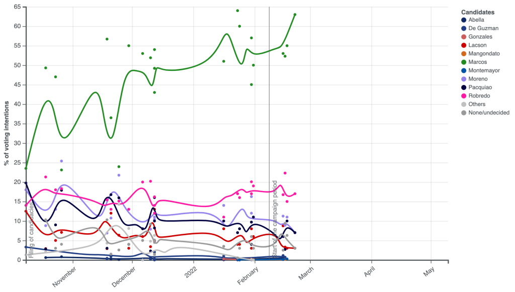 An interesting effort can be found in Wikipedia, which simply aggregates all the different reported surveys, regardless of methodology or credibility of the outfits. See Opinion polling for the 2022 Philippine presidential election.