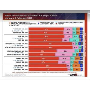 First, we must understand that Bongbong Marcos is not the superstar here. Another reputable survey (not SWS) shows that Bongbong’s authentic base of voters is at 20 percent, plus or minus. Thirty percent of his votes are attributed to President Duterte. The President still enjoys a 75 percent approval rating.  Data show that 55.83 percent of the voting public view Bongbong as “Duterte Lite” or the continuity of the regime. Whether this is true or not is another story. Marcos has become the sole beneficiary of Sara Duterte’s decision to slide down to vice and Bong Go’s decision to bow out of the race.